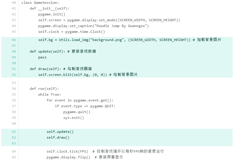 有了Utils工具类后,就像导演搭建舞台一样,即可对GameSession进行修改,增加bg属性和update、draw方法,分别用以存储背景图片和更新游戏数据以及绘制游戏界面,直观效果即游戏界面可加载背景图片显示的更好看了。
