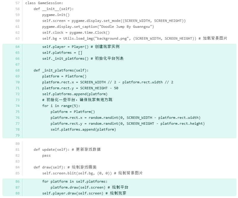 为了让玩家能够有地方停留住,我们将第一个平台固定在屏幕底部正中央,其它平台则随机生成铺满即可,更新后的GameSession类如下。