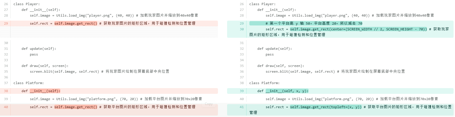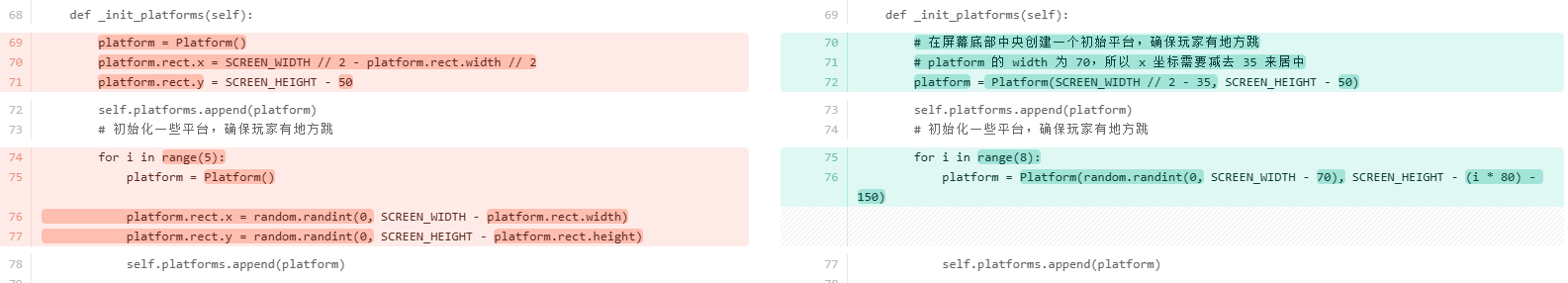 可以发现平台生成的位置也太随意了,我们理应控制平台生成的高度间距以确保玩家可以跳上去,因此把Platform类的初始化函数做修改,将生成坐标改外外部传参以方便指定位置,待后续调整时方便修改。同时玩家还需要调整位置站在第一个平台上面。