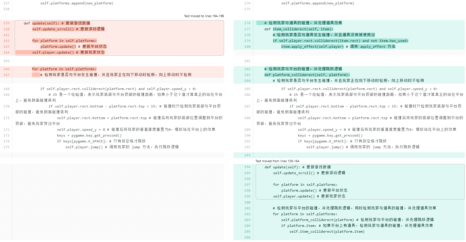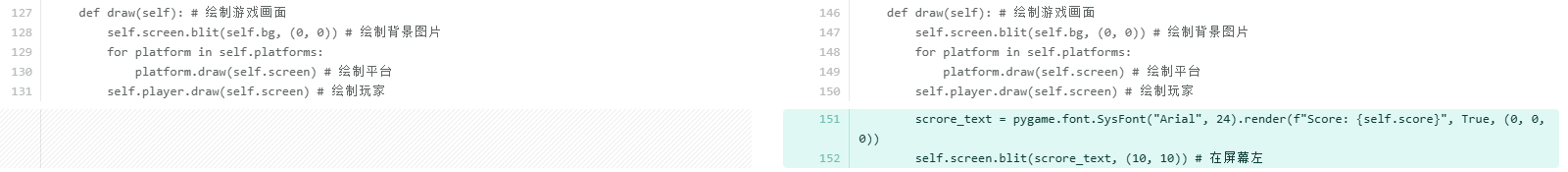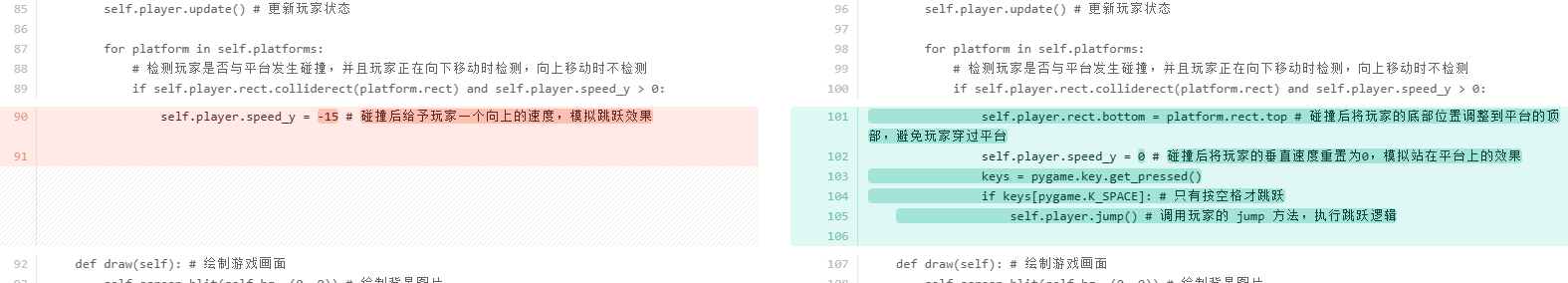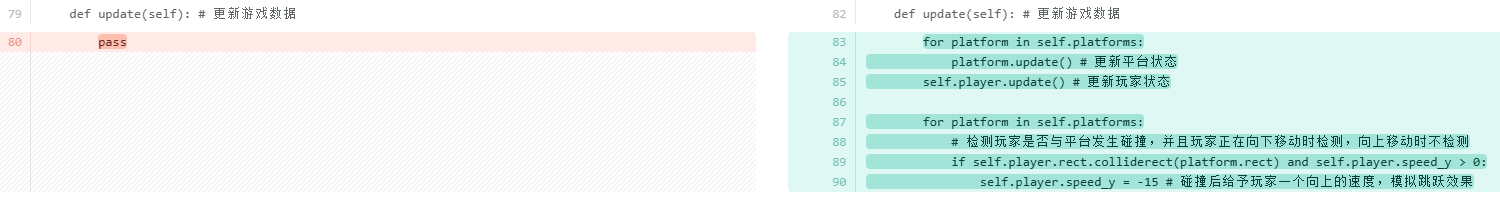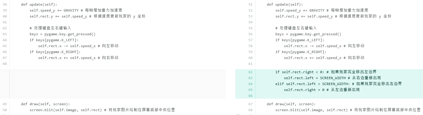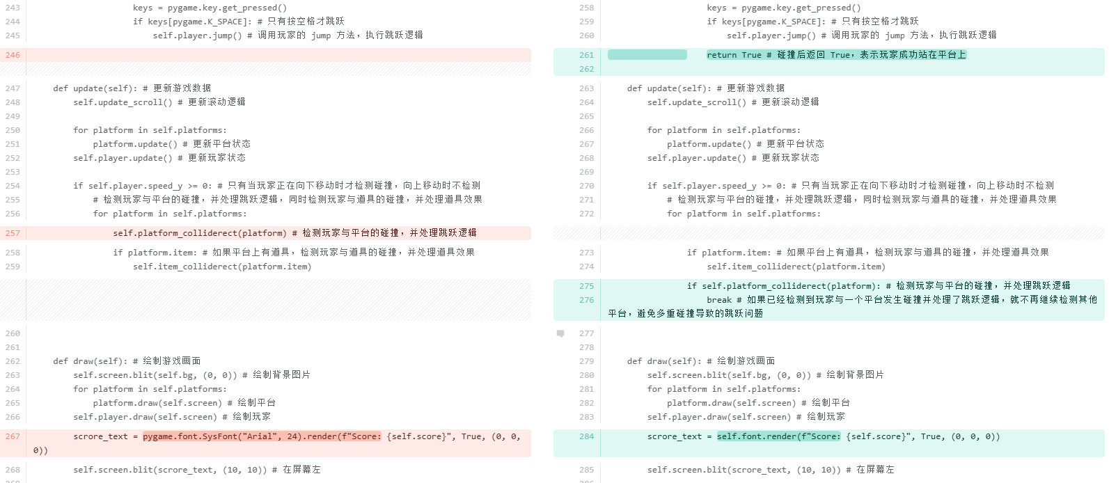考虑到当玩家掉到屏幕外时直接调用__init__方法可能存在一些风险,比如重复初始化 Pygame 导致系统资源分配异常或某些模块状态错乱;每次都会重新创建pygame.display.set_mode和多个pygame.font.SysFont对象,旧的对象如果没有被 Python 的垃圾回收机制及时清理,会导致内存占用不断上升。所以单独抽取出来reset_game方法,只初始化游戏内的对象数据。