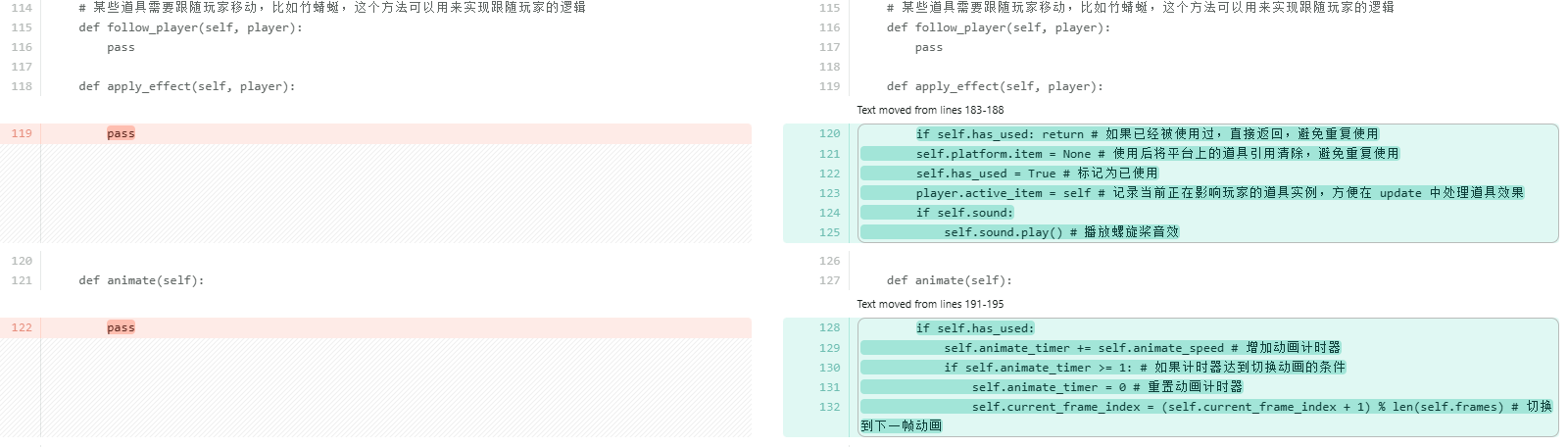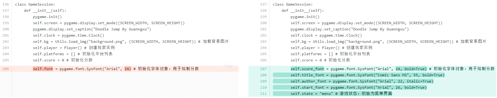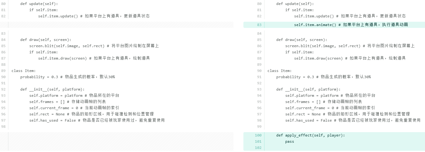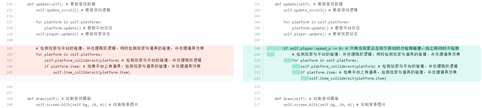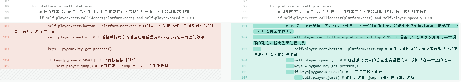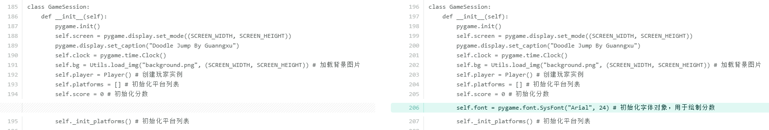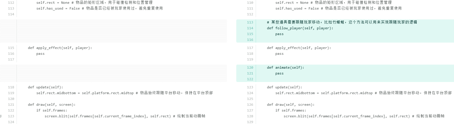 考虑到当玩家掉到屏幕外时直接调用__init__方法可能存在一些风险,比如重复初始化 Pygame 导致系统资源分配异常或某些模块状态错乱;每次都会重新创建pygame.display.set_mode和多个pygame.font.SysFont对象,旧的对象如果没有被 Python 的垃圾回收机制及时清理,会导致内存占用不断上升。所以单独抽取出来reset_game方法,只初始化游戏内的对象数据。