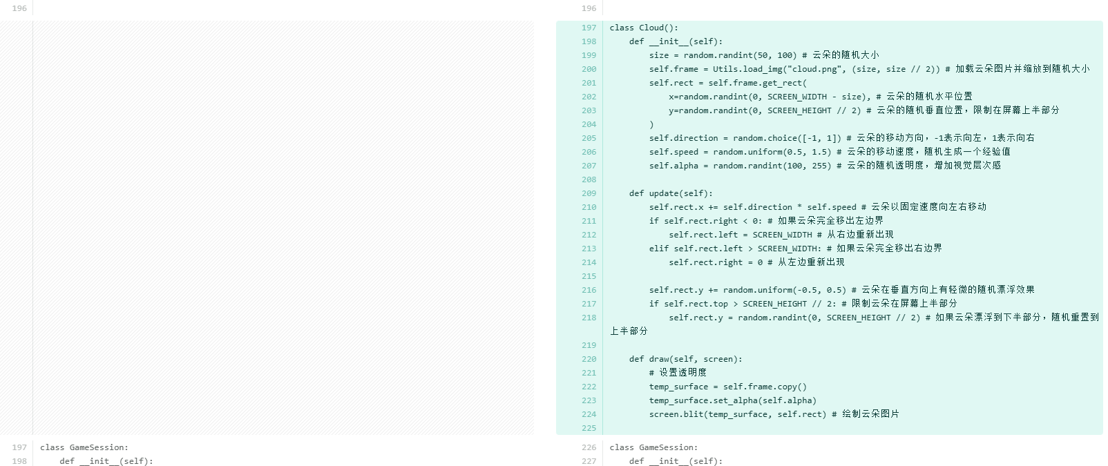 self.alpha = random.randint(100, 255) # 云朵的随机透明度,增加视觉层次感